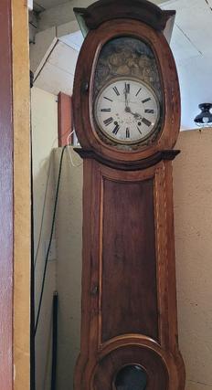 Grandfather clock with beautiful carved round bonnet. Circa mid 1800's. 8 day time and strike movement w/ gong strike.